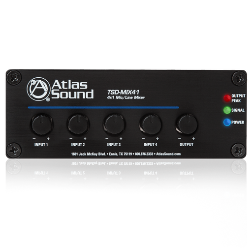 ATLAS SOUNDMezclador de micrófono (PZA) Mezclador de micrófono/línea 4 x 1 El mezclador de micrófono/línea 4x1 TSD-MIX41 es ideal para aplicaciones donde es...