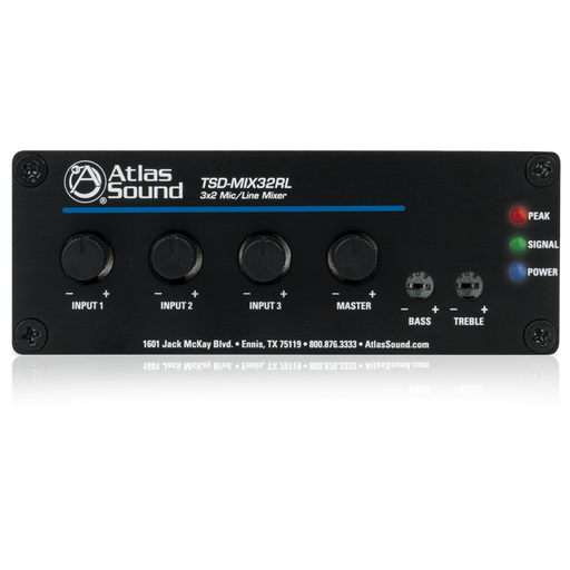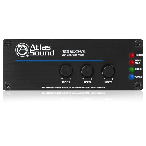 ATLAS SOUNDMezclador de micrófono (PZA) El mezclador de micrófono/línea 3x1 TSD-MIX31RL incluye dos entradas de micrófono/línea balanceada a través de conec...