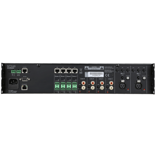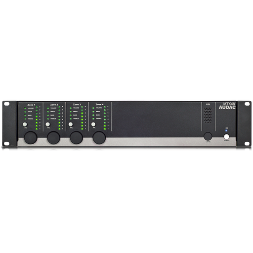 AUDACMTX48 (PZA) Matriz de audio de 4 zonas El MTX48 es la versión de cuatro zonas de la serie MTX, que contiene dos entradas de micrófono balancea...
