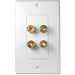 These state-of-the-art speaker wall plates create a custom finish with wires neatly tucked behind the wall. With this white wall plate featuring an in-wall speaker for amplifier connections, use bare 12-gauge wire or 8- to 16-gauge banana plugs. Opt for banana plugs if you want to make quick and easy connections. On this color-coded WP4 unit, the red terminals are positive and the black terminals are negative.