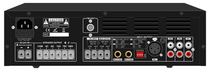 Compact 120W mixer amplifier for commercial audio use, with 3 microphones, 2 auxiliaries, 100V and 8 Ohms.
