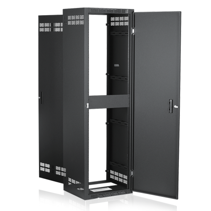 Ofrece varias ventajas fáciles de instalar, incluida una abertura ampliada de 6RU en la parte superior e inferior del gabinete que se puede dejar abierta para acceso a cables y/o ventilación, o cerrarse mediante una ventilación estándar o paneles sólidos. Las puertas traseras (incluidas con todos los modelos) cuentan con bisagras de resorte de liberación rápida que les permiten girar 180° para abrirlas hacia la derecha o hacia la izquierda. Si se solicita una puerta delantera, tendrá una llave diferente a la de la puerta trasera por motivos de seguridad.