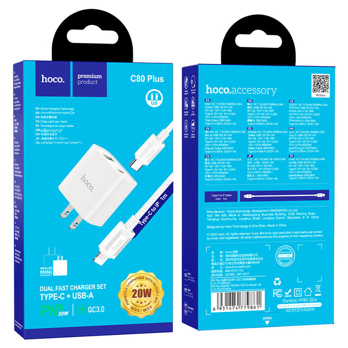 Cargador de pared C80 Plus Rapido, salida USB de 18 W y tipo C de 20 W, enchufe de EE. UU., conjunto con cable tipo C a Lightning o tipo C a tipo C.