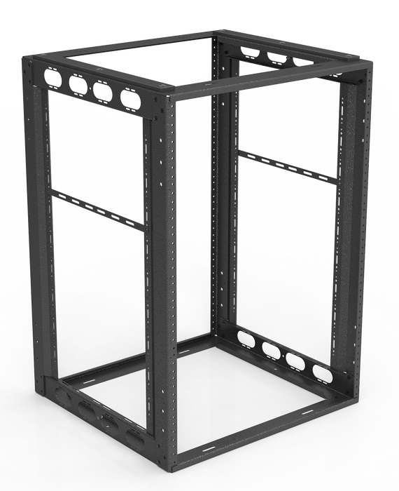 Todos los modelos incluyen rieles de rack montados en la parte delantera y rieles de rack traseros en todas las alturas de rack para instalaciones que requieren soporte de montaje adicional. Hay disponible un kit de deslizamiento opcional, AFR16RK o AFR18RK, que permite que el bastidor se deslice fácilmente hacia adentro y hacia afuera del mueble en el que está montado para un acceso rápido a los componentes instalados. Cada modelo se construye en nuestras instalaciones de Ennis, TX, utilizando CRS duradero de calibre 16 con un acabado en una capa de polvo electrostático negro.