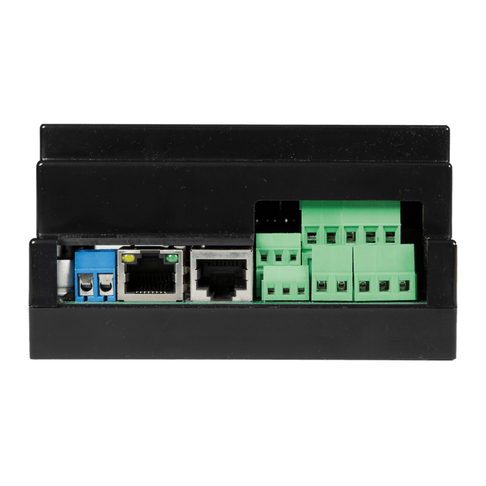 La integración de numerosas unidades ARU20x en un sistema es posible gracias al RS485 que permite la conexión en cadena de varias unidades. El ARU208 cuenta con un conector de entrada y salida RS485, lo que permite conexiones aún más convenientes. Las posibilidades de control TCP/IP permiten la integración de los ARU20x en cualquier red ethernet. El navegador web integrado que ejecuta una interfaz HTML5 permite la operación más flexible y completa, mientras que el conjunto de comandos disponible gratuitamente permite la integración con cualquier sistema de control o automatización basado en TCP/IP. La parte delantera de la carcasa de ABS negro ofrece una breve descripción de sus posibilidades de conexión, mientras que la parte posterior está equipada con un mecanismo de montaje por resorte que permite un fácil montaje en rieles DIN estándar ampliamente disponibles. De esta forma es posible integrarlo fácilmente en cualquier armario eléctrico donde pueda ser alimentado mediante la fuente de alimentación opcional PSD24x.