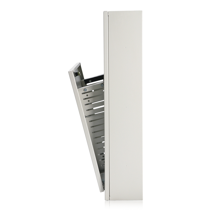 . con una puerta inclinable con cerradura CRS de calibre 16 que se cierra contra la placa frontal del bastidor. La puerta de montaje en superficie está sujeta al marco internamente con bisagras estilo 2 pasadores para evitar manipulaciones. Las puertas se pueden abrir en dos posiciones: inclinadas para su funcionamiento