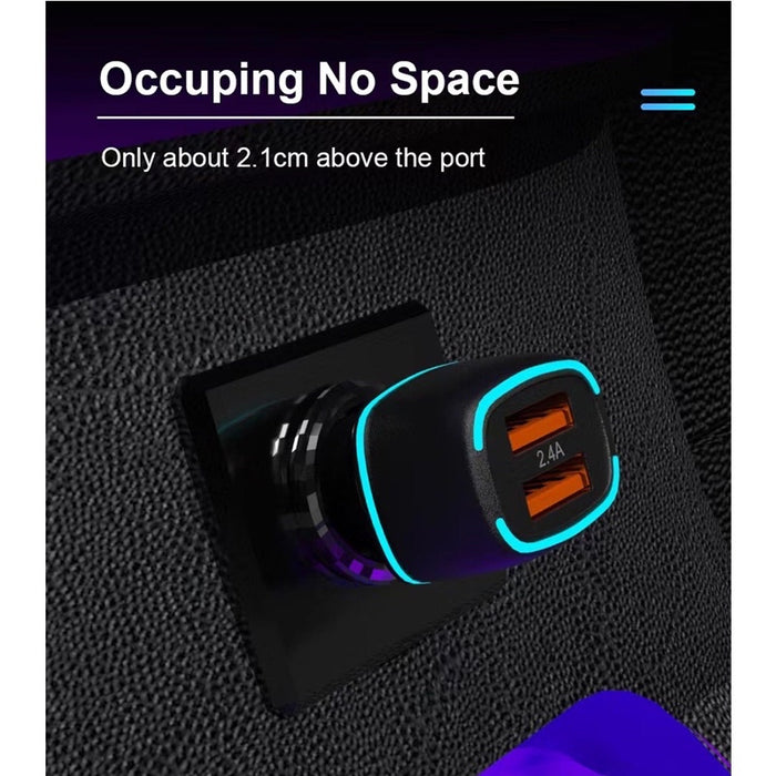 Cargador de móvil para coche, equipado con dos puertos USB Tipo A que sirven para cargar dos dispositivos simultáneamente. Tiene un diseño especial y ocupa muy poco espacio. Con diseño estético, equipado con luces LED.