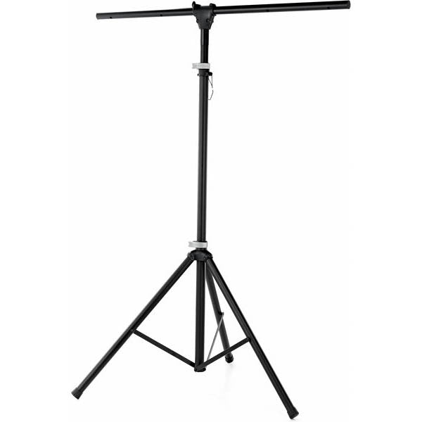 Soporte de iluminación de aluminio ligero con barra transversal. Construcción estable y plegable de 3 patas. La altura y los pies se ajustan mediante una palanca de sujeción fácil de usar. El pasador de seguridad adicional garantiza un soporte seguro. Barra transversal con orificios para hasta 8 focos.