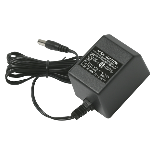 La fuente de alimentación compacta de 12 VCC (200 mA) tiene un mini enchufe de 1/8" para conexión directa al bloque conector M-1CB4B (alimenta hasta cuatro flashes infrarrojos F-1) o para usar con hasta tres controles de volumen WhisperTouch conmutados.