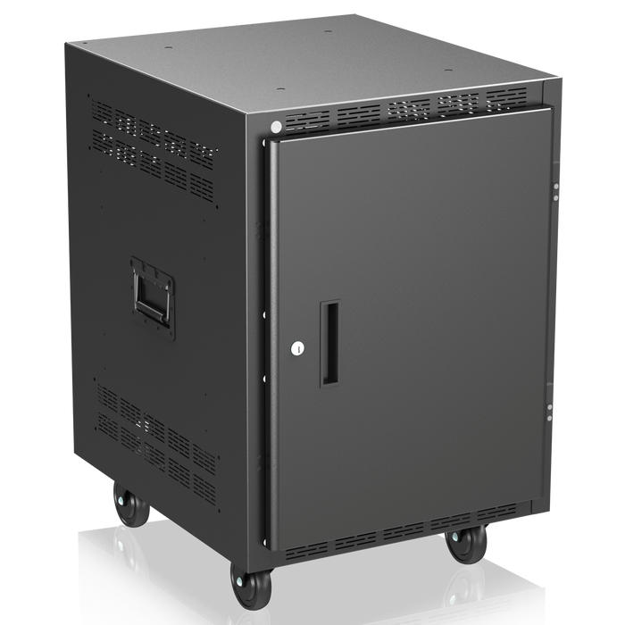 El estante para equipo móvil de 30 pulgadas de profundidad y 14RU incluye: ruedas y manijas laterales