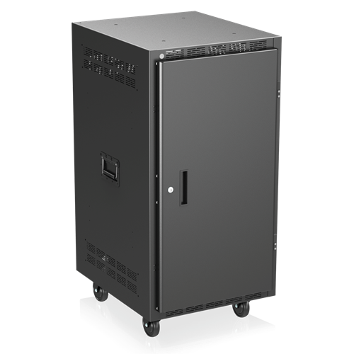 El gabinete móvil RX21-25 está construido de manera robusta con CRS de calibre 16 e incluye ruedas de alta resistencia. Equipado con un par frontal de rieles de montaje ajustables CRS de calibre 11 con rosca 10–32 en un espaciado estándar EIA de 5/8"- 5/8"-1/2".