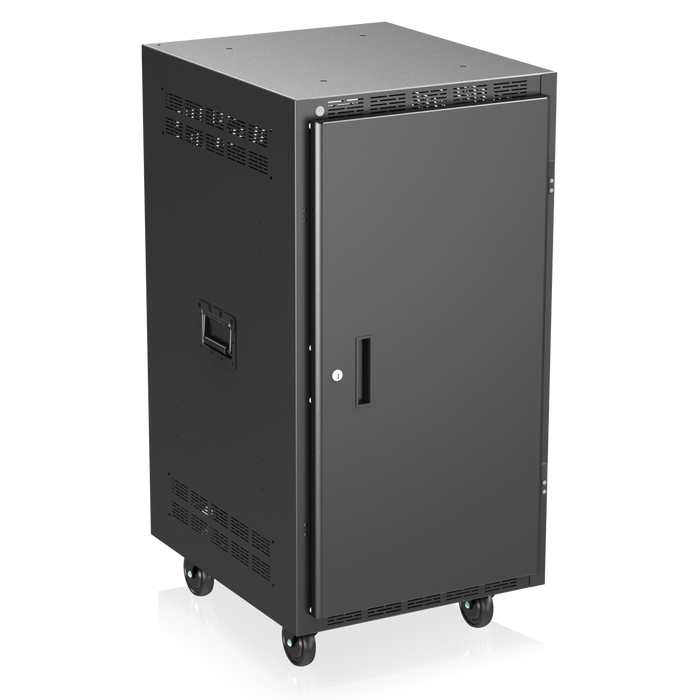 El estante para equipos móviles de 21RU y 30 pulgadas de profundidad incluye: ruedas y manijas laterales